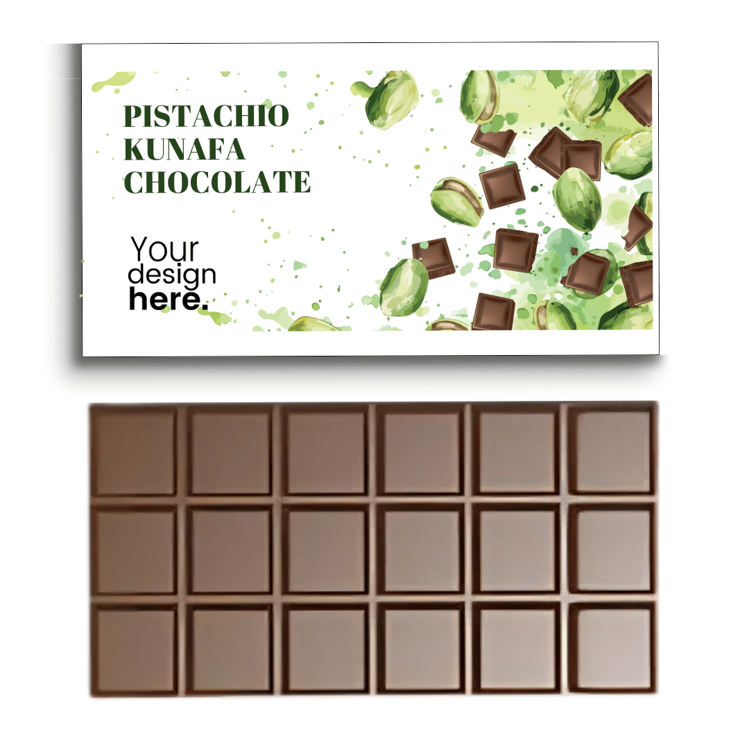 A luxurious chocolate bar infused with the rich flavors of knafeh and crunchy pistachios—a unique gourmet treat perfect for gifting or events.