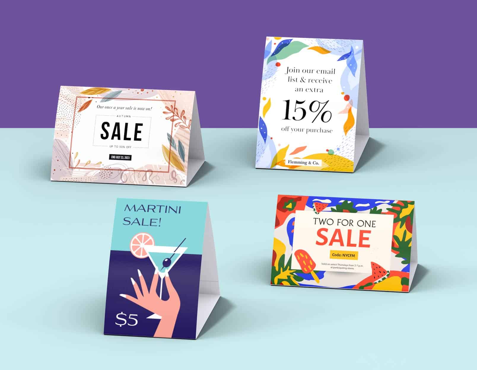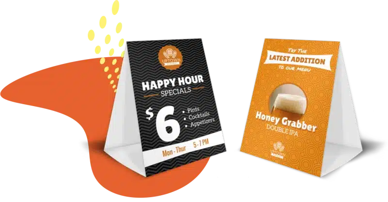 Custom table tent cards designed for impactful tabletop promotions—perfect for events, retail, hospitality, and branding.